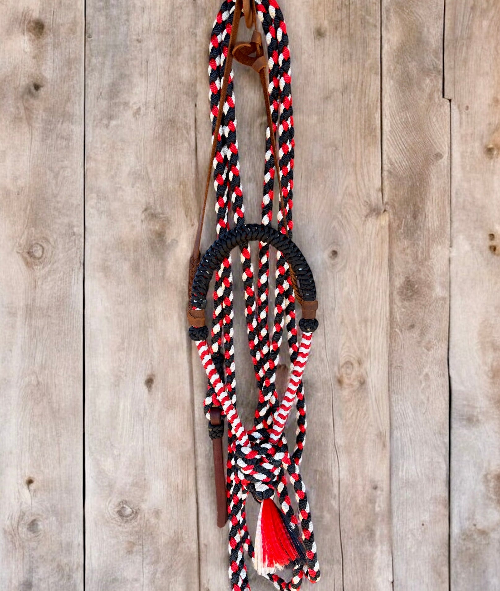 Lariat Braided Core Hackamore and Mecate Set: Fits most Horses - Black, Red, and White (hanger and popper styles vary)